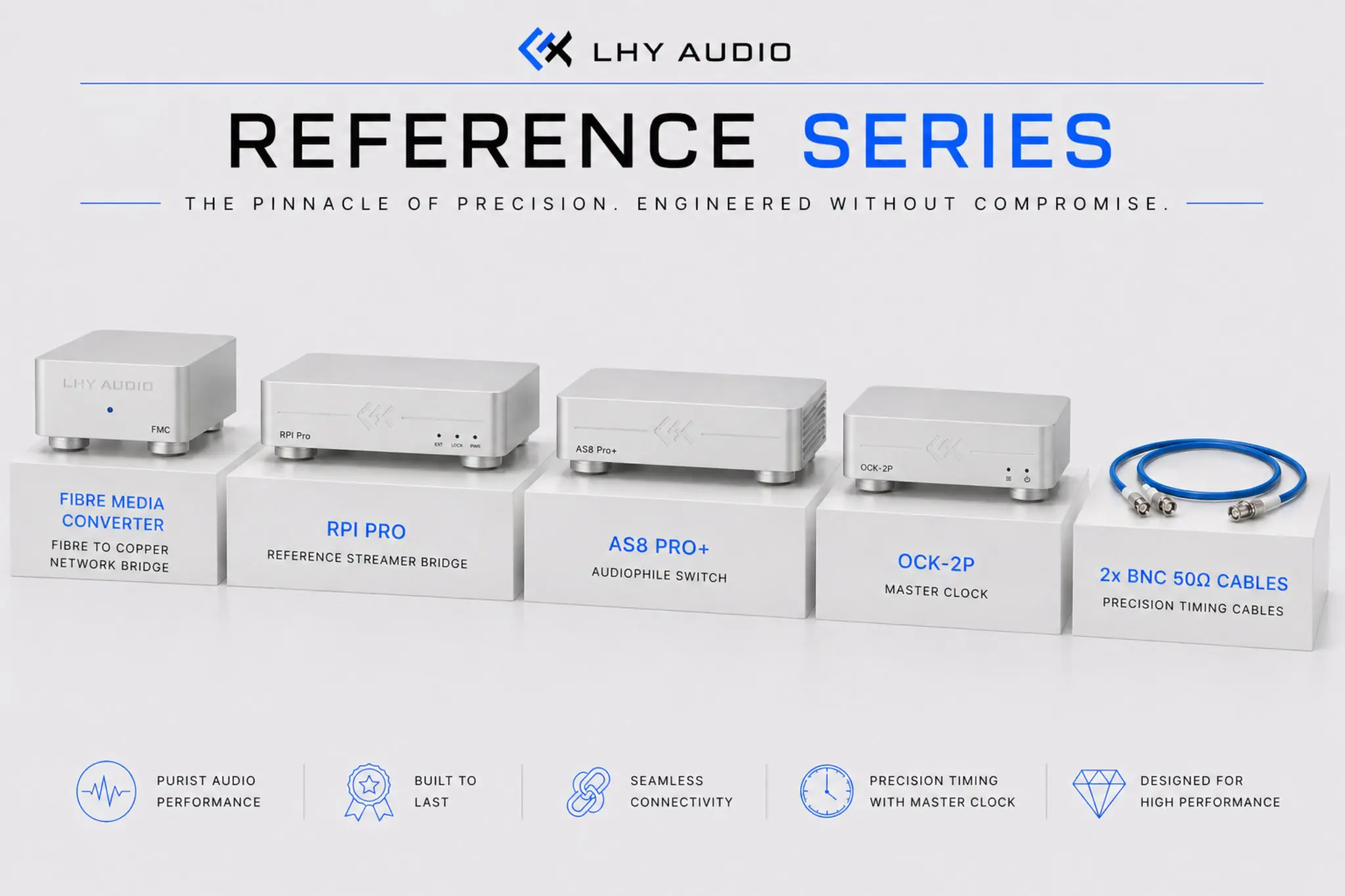 The LHY Audio Reference Bundle is the ultimate expression of a fully optimised digital front end, delivering a complete isolation and synchronisation chain from network input to DAC. Combining fibre media conversion (FMC), the AS8 Pro Plus Audiophile Switch, RPi Pro Streamer & Bridge, and the flagship OCK-2P Master Clock—with dual 50Ω BNC clock cables—this bundle is engineered for absolute signal purity, precision timing, and reference-level performance.